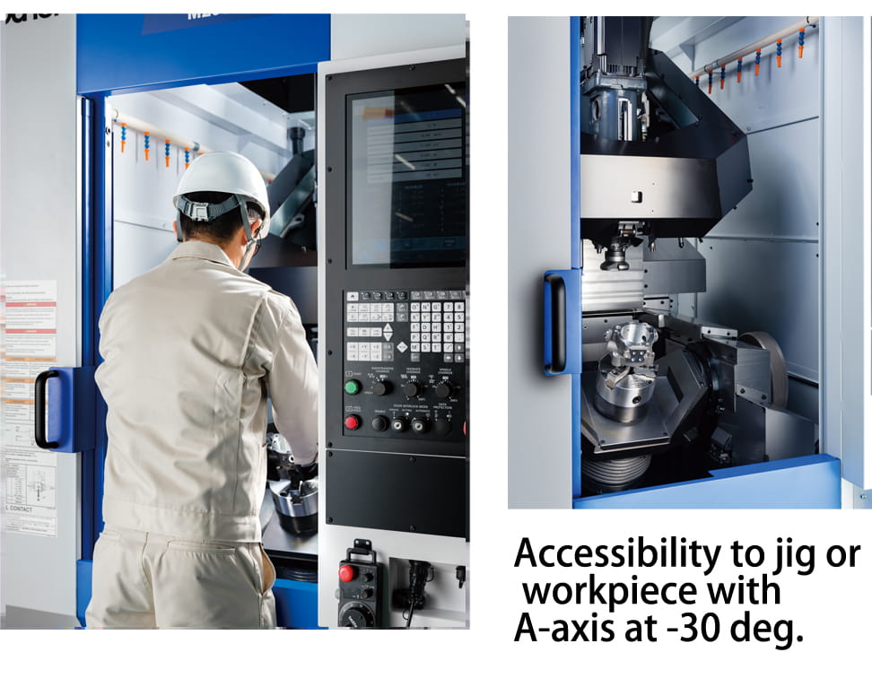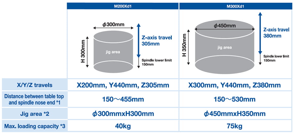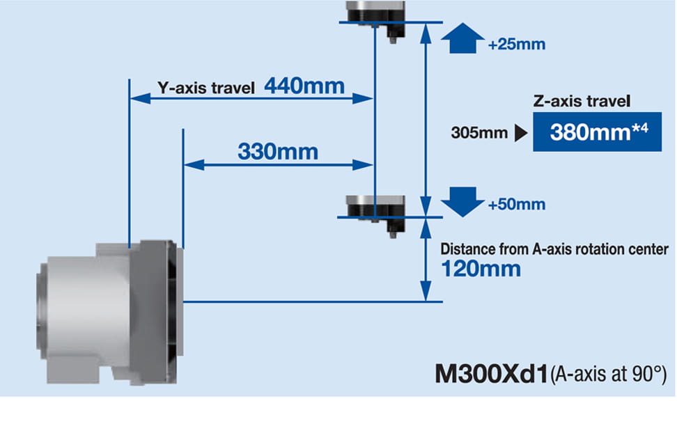 Eine großzügige Spannvorrichtungsfläche wurde geschaffen, um Flexibilität bei der Konstruktion von Spannmitteln für unterschiedliche Werkstücke zu gewährleisten. Insbesondere bei der M300Xd1 wurde der Spannvorrichtungs-Durchmesser auf ø450 mm erweitert, der Verfahrweg der Z-Achse auf 380 mm erhöht und der Abstand zwischen Tischoberfläche und Spindelkopf vergrößert. Dies ermöglicht einen großzügigen Bearbeitungsraum in Z-Richtung sowie eine verbesserte Werkzeugzugänglichkeit.