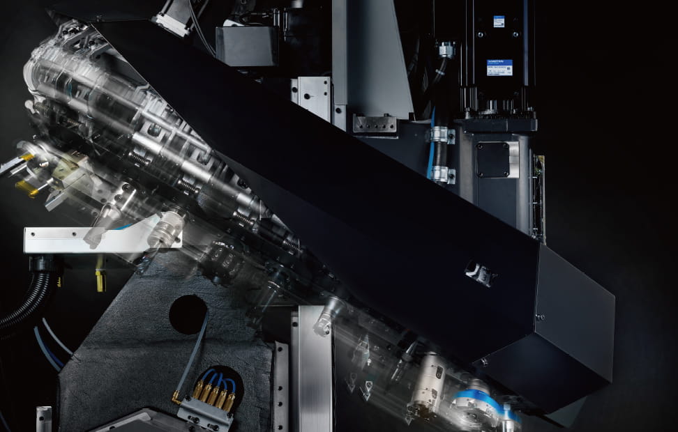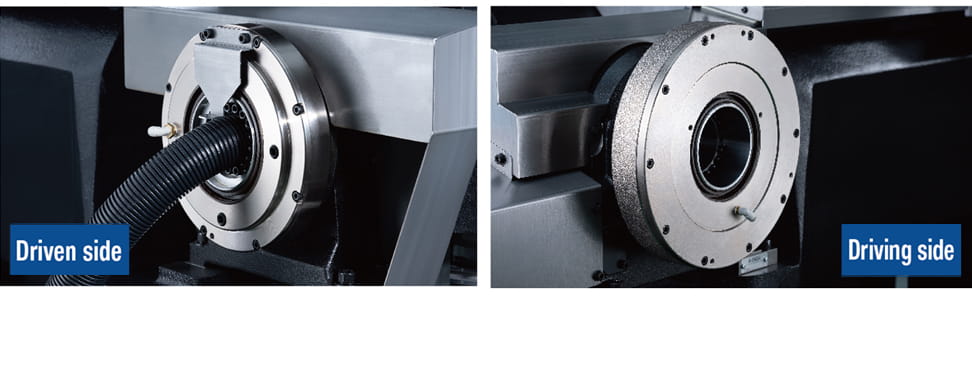 Durch den Einsatz einer Spindel mit geringem Trägheitsmoment und eines Spindelmotors mit hoher Beschleunigung/Verzögerung wurde ein schnellerer Start/Stopp der Spindel erreicht. Zusätzlich erreicht die Drehspindel mit DD-Motor eine hohe Beschleunigungs- und Verzögerungsdrehzahl.