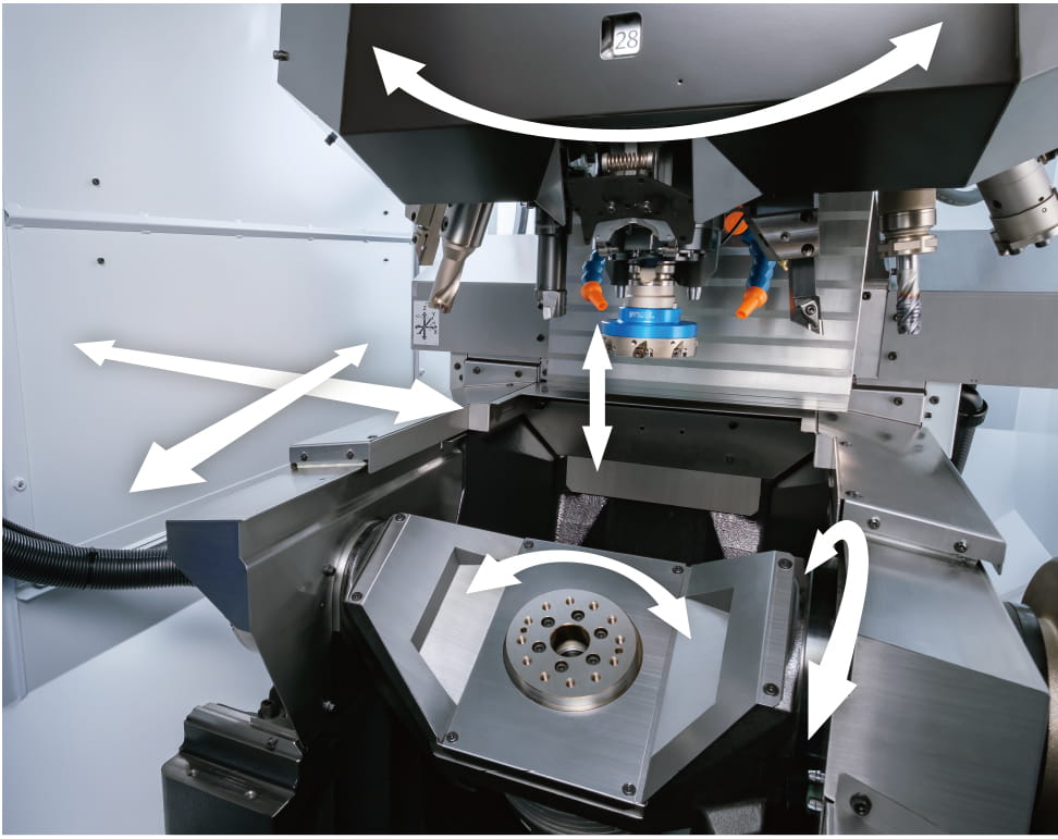 Diese Eigenschaften gewährleisten, dass die Maschine hohe Bearbeitungsleistungen bei komplexen Bearbeitungen oder Mehrseitenbearbeitungen erbringt.