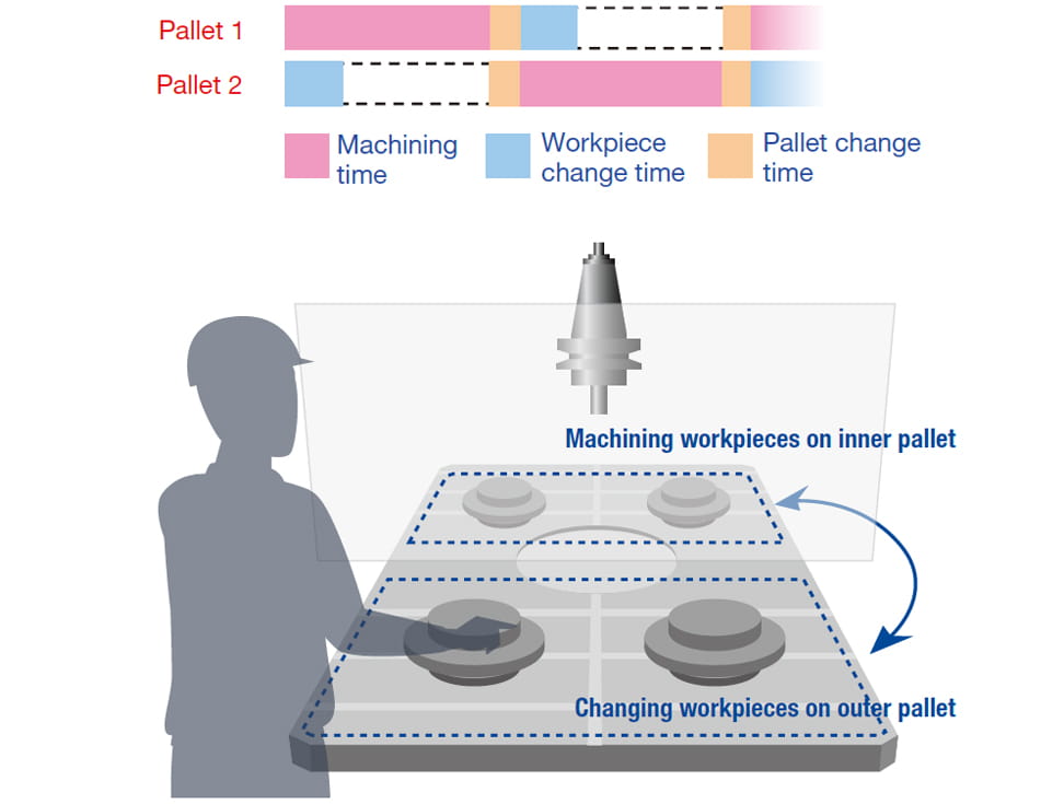 Durch die optimierte Beschleunigungs-/Verzögerungssteuerung wird ein wesentlich schnellerer Palettenwechsel erreicht.