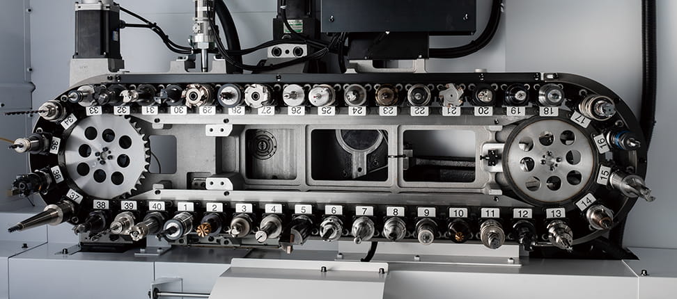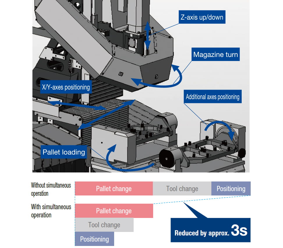 Die extrem hohe Produktivität wird hier durch die Vorteile der integrierten Entwicklung von Maschine und Steuerung erreicht, einschließlich optimierter und deutlich beschleunigter Simultan- und Werkzeugwechseloperationen.