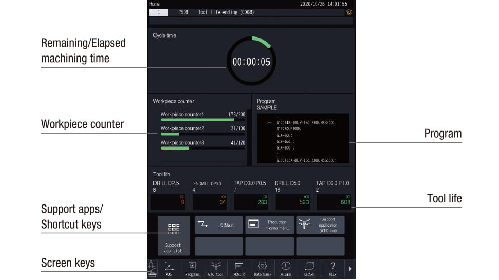 | Support apps | Adjust machine parameters ATC tool Tool life Waveform display Production performance Power consumption Recovery support Inspection PLC |
